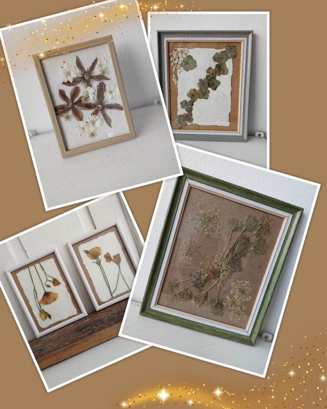 Vrouwengezicht met verschillende soorten paarstinten gedroogde bloemen in een houtkleur lijst.